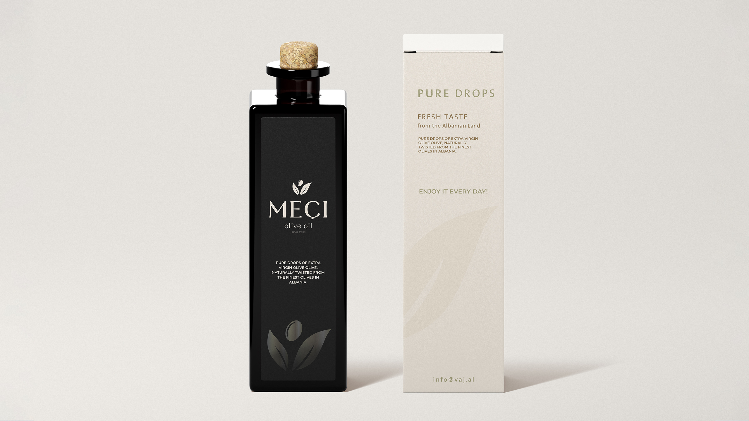 Naming, branding and packaging design for Meçi Olive Oil produced in Albania. Extra virgin olive oil is the purest form of oil that comes straight from the olive trees, without having undergone industrial processing. We chose the green colour and space to define purity. The vividness of the leaf was created to define the wholeness of the olive oil as one of the most essential nutrition element.